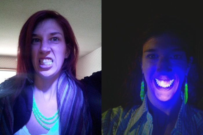The following image from reddit user 33mmeyes shows natural and porcelain teeth of today against a uv light. The natural teeth glow, whilst the porcelain ones do not.