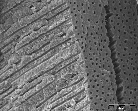 Whilst dentists go to great effort to clean and steralise the central canal, there is a much larger part of the tooth that there is no known way scientifically to fully steralise, the dentin. Dentin is the hard part, just under the enamel that makes up most of the rest of the tooth. Under a microscope it looks like this: