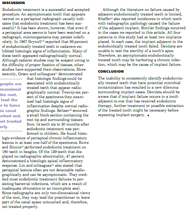 There isn't much research on the safety of root canals, even though dentists have been performing this procedure for over 100 years. I did however find some useful information in The Journal of the American Dental Association's own papers. The paper entitled Implant failures associated with asymptomatic endodontically treated teeth, deals with the problem of failing implants next to root canals. It gives some interesting incites into the problem.